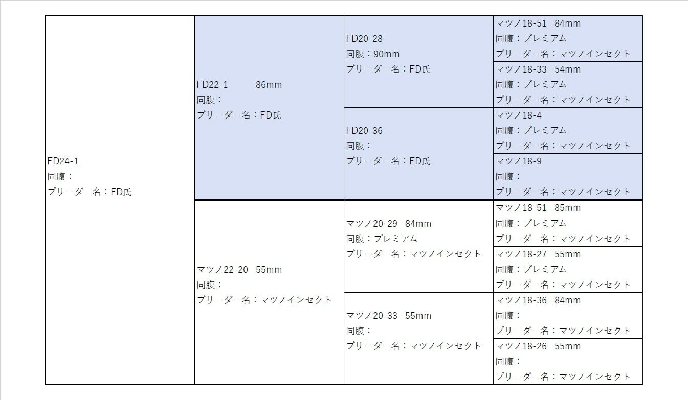 マツノインセクトのHPに掲載されているFD20-28の血を♂側にもつ背景となっております。